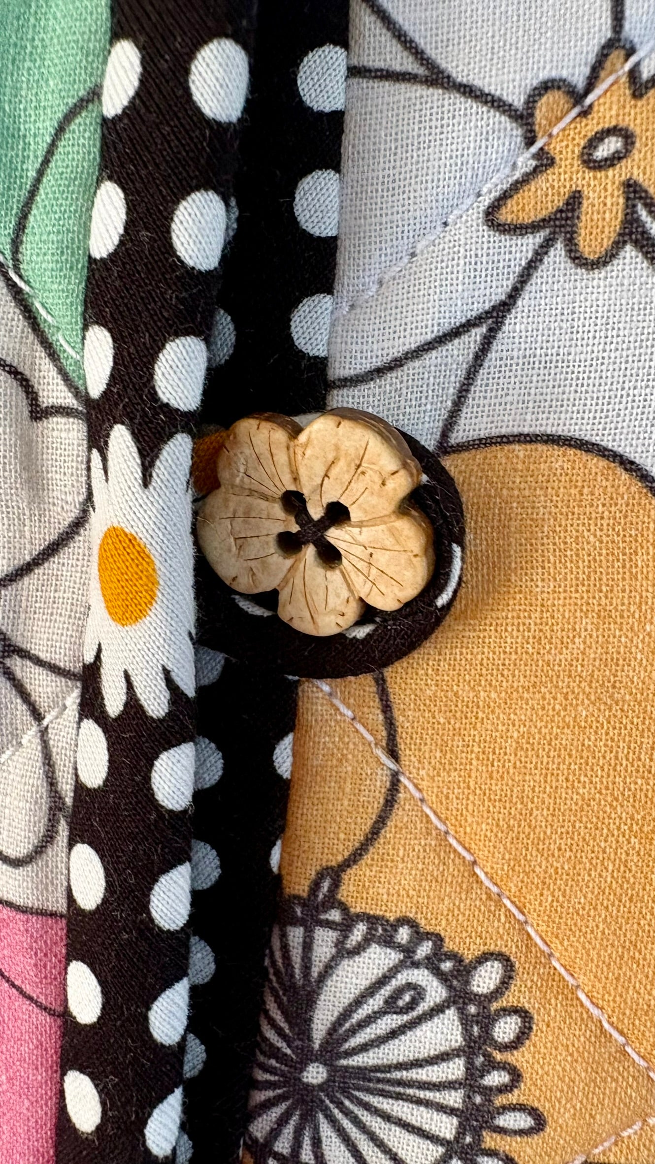 This one-of-a-kind quilted jacket is a true statement piece, blending vintage charm with sustainable style. Made from a beautiful 1970s vintage sheet paired with linen offcuts and lined with soft jersey fabric rescued from an op shop, every element tells a story. Thoughtful details include unique wooden flower buttons, practical patch pockets, reinforced elbow patches, and a flattering stand-up collar finished with hand-stitched bias binding. Crafted with attention to detail and bound seams for a beautifully neat finish inside and out. Size Small (10-12)